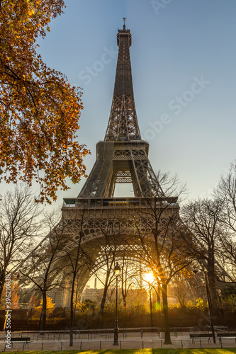 Paris, France - November 26, 2020: A nice view of the Eiffel Tower at sunset in Paris, France