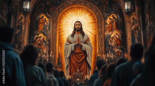 Parishioners gathering in church and praying in front of a statue of jesus christ