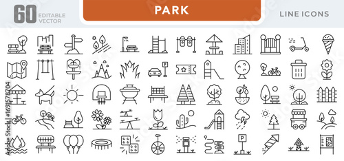 Park linear icon set. Trees, benches, playground, nature, recreation, outdoor, greenery, picnic, walking, environment, vector outline icon set. UI thin line icon pack