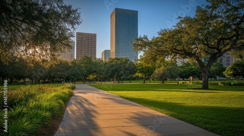 Park Pathway Leading Towards Tall Buildings Under Blue Sky