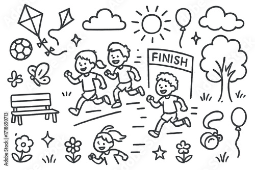 Park Race Doodles. Hand-drawn doodle illustration Running races in the park [children running, finish line, ribbon, whistle, ball, kite, butterfly, flower,