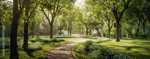 Park with a forested area and winding paths, 4K hyperrealistic photo,