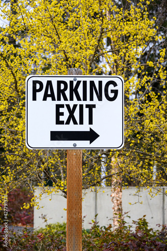 Parking Exit sign in black and white with a yellow forsythia bush blooming in the background