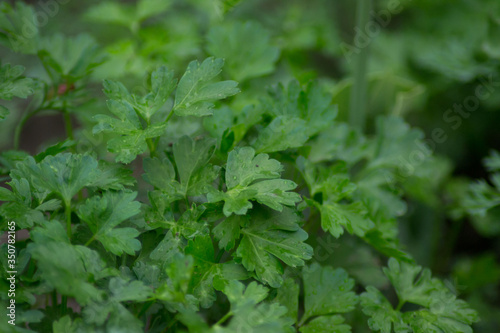 Parsley in the garden outdoors, green leaves background, edible herb, plant leaf, organic vegetable garden