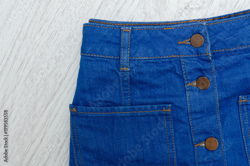 Part of blue denim skirt with buttons. Details