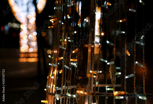 Part of Christmas decorative silver, white, yellow, golden flashing lights. Detail of New Year and Christmas decorations, string rice lights bulbs. Ornaments to christmas celebration, holiday scene.