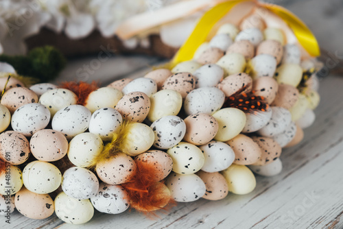 Part of festive Easter wreath with many decorative eggs. Decoration for the spring holiday close-up.