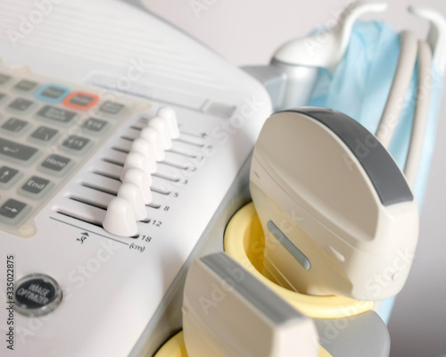 Part of the ultrasound apparatus. Nozzles and buttons visible, blurred background