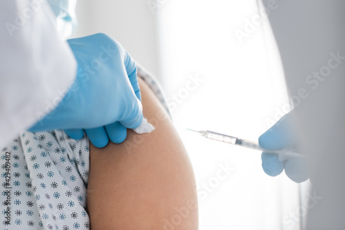 partial view of doctor in latex gloves doing vaccine injection to patient