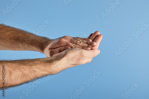 partial view of man washing hands isolated on blue