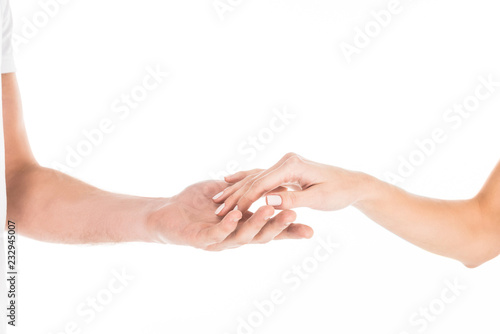 Partial view of people tenderly holding hands isolated on white