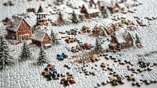 Partially Completed Jigsaw Puzzle Depicting a Snow-Covered Christmas Village
