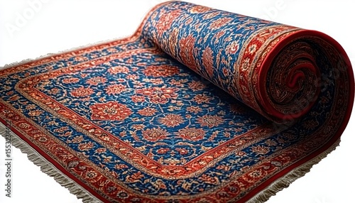Partially rolled traditional ornamental rug with intricate floral patterns in blue, red, and beige colors conveying elegance and craftsmanship