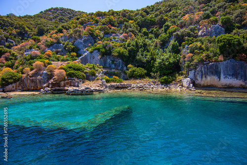 Partially Sunken Lycian City Simena (Kaleköy) with Ruins Extending into Sea, Kekova Region, Turkey