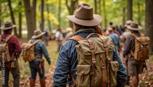 Participants in historical reenactment wearing hydration packs, woodland setting