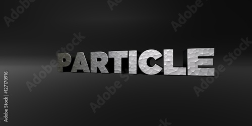 PARTICLE - hammered metal finish text on black studio - 3D rendered royalty free stock photo. This image can be used for an online website banner ad or a print postcard.