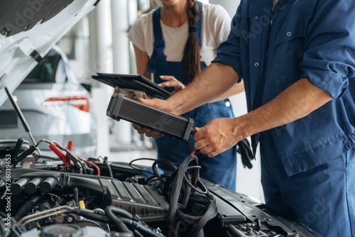 Particle close up view of male and female mechanics that are repairing the car