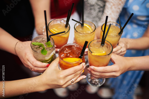 Party at the hotel with cocktails. Cheerful bachelorette party.
