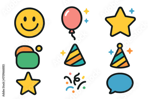 Party celebration flat icon set. featuring smiley, balloon, star, celebration hat, confetti, and speech bubble icons