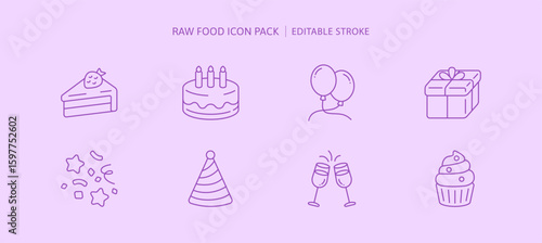 Party icon set, Balloon, gift box and confetti decoration element for Happy Birthday, Valentine or Anniversary celebration special day. Drinks and food, champagne, cupcake, cheesecake editable icons.