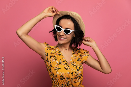 Party time. Close-up photo of a young happy woman in yellow dress and sunglasses, who is touching her straw hat and smiling.