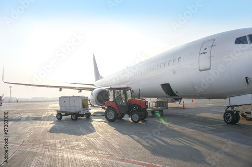 Passenger aircraft at the airport near the terminal. Unloading and loading baggage. Stock photo