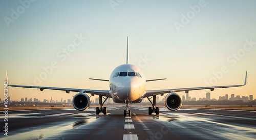Passenger Airplane on Runway at Dawn.
