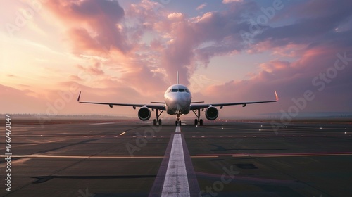 Passenger Plane on Runway Collection: Aircraft Taking Off and Landing at Sunset, Night, with City Lights and Scenic Skies for Aviation, Travel, and Airport Visuals