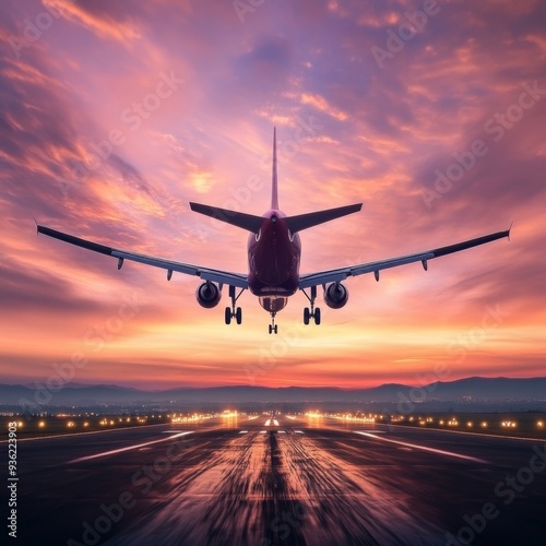 passenger plane take off from runways against beautiful dusky sky with copy space use for air transport ,journey and traveling industry business