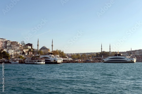 Passenger ships in the Bosphorus Strait at the Uksyudar Shehir Khatlary Isklesi Maritime Station on the Asian side of Istanbul
