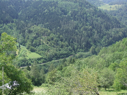 Passenger train riding among mountains. Mountain landscape
