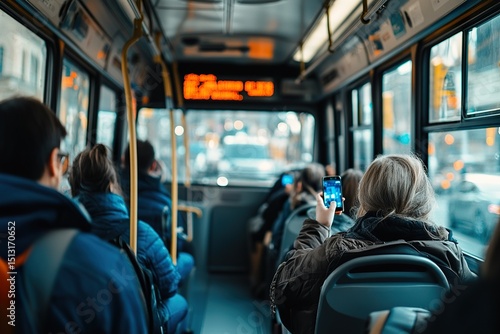 Passengers riding city bus with mobile phones during commute