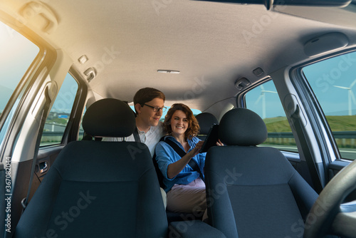 Passengers sit in the back seat and look at the digital tablet while self-driving car rides on the highway.