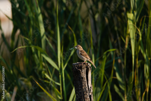 Passer domesticus - Sparrow bird perched on a tree stump. Wild songbird