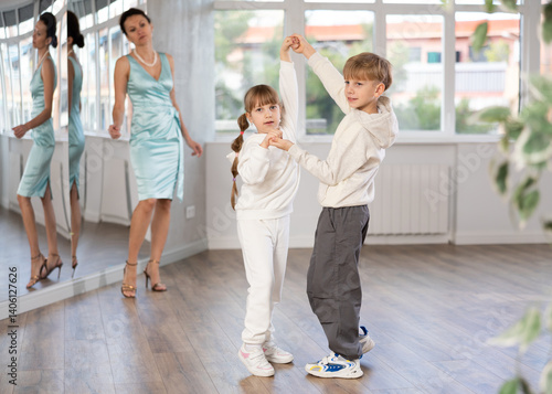Passionate tween dancers, girl and boy practicing ballroom dancing in dance studio, gracefully performing waltz while female trainer monitoring technique and progress..