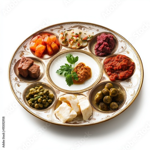Passover seder plate displays various traditional foods. Dishes include roasted meat pieces, vegetables, dips, olives. Plate ornate, elegant. Isolated on white background. Visual represents Jewish