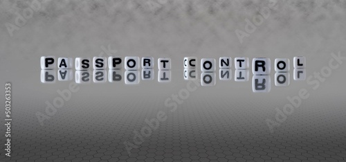 passport control word or concept represented by black and white letter cubes on a grey horizon background stretching to infinity
