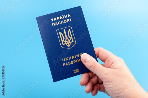 Passport of a citizen of Ukraine in a female hand on a blue background, close-up. Inscription in Ukrainian Ukraine Passport