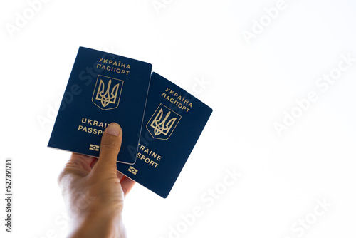 Passport on the white background. Emigration, immigration, refugee, evacuation of civilians, families from Ukraine crossing border. Stop war, support, care concept. Hand. Space for your text.