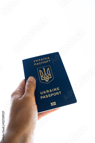 Passport on the white background. Emigration, immigration, refugee, evacuation of civilians, families from Ukraine crossing border. Stop war, support, care concept. Hand. Space for your text.
