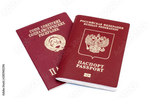 Passports of the Russian Federation and the Soviet Union on a white background.