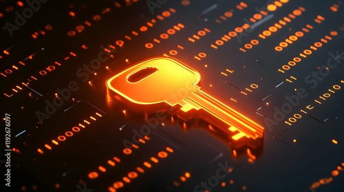 Password management concept visualized by a glowing orange 3D key resting on a metallic password field with faint embedded code