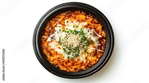 Pasta dish with cheese and herbs in a black bowl on white background.
