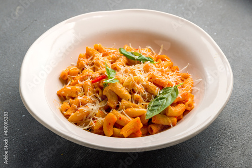 Pasta Penne arabiata with tomato sauce on grey concrete table