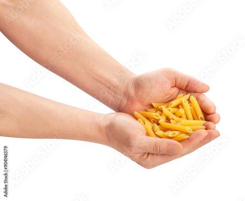 pasta penne rigate in hand path isolated on white