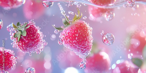 Pastel and plush arrangement of strawberry jelly charms drifting above shimmering liquid.