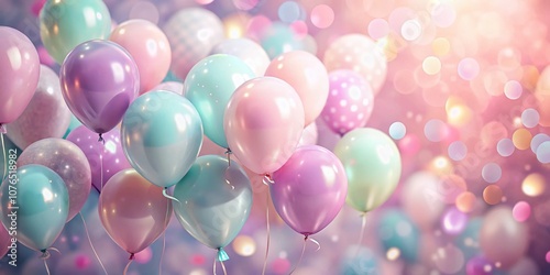 Pastel Balloons Floating Gracefully Against a Soft Pink Background, Captured with Bokeh Effect for a Dreamy and Whimsical Atmosphere in Celebratory Themes