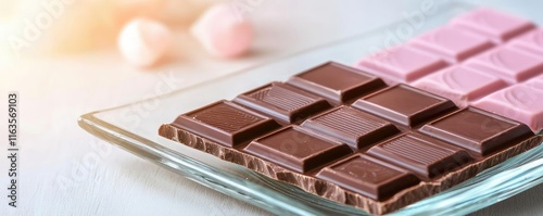 Pastel chocolates idea. Delicious chocolate bars on a glass plate, perfect for dessert and indulgence.