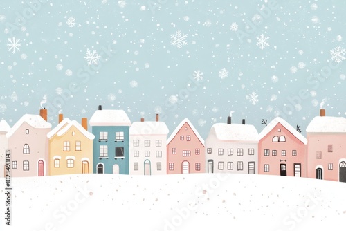 Pastel Christmas village with cute houses in the snow, with text space for holiday wishes