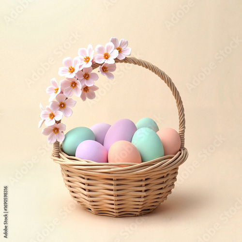 Pastel colored eggs in a wicker basket with flowers on beige background